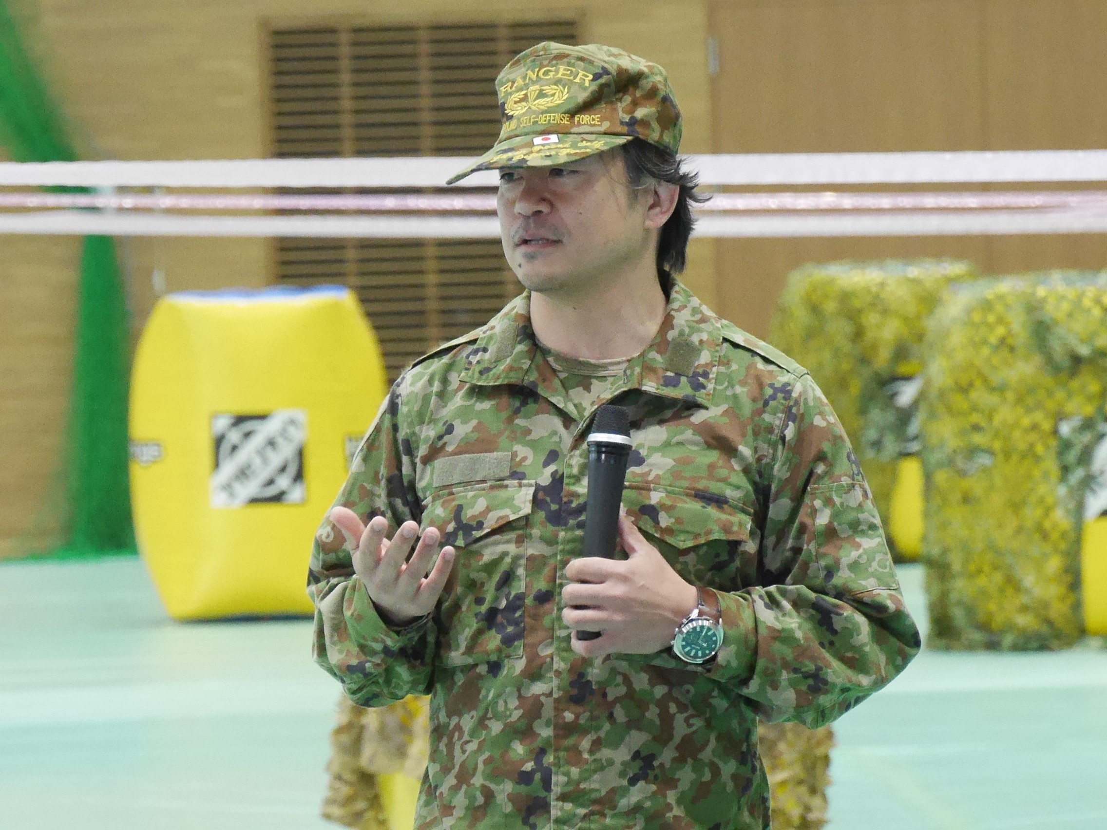 講師やスタッフは全員元自衛隊。ゲームも、殲滅戦から、リーダーがやられたら負けのVIP戦、さらに今回はフラグをつかったゲームやコインを集めるゲームなど4つのタイプのゲームでチーム対抗戦を行いました。